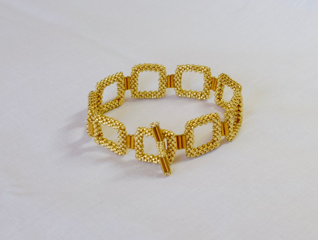 This is a very delicate design of little beaded squares joined by gold bugle beads. Beautiful in gold.