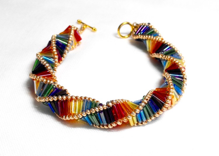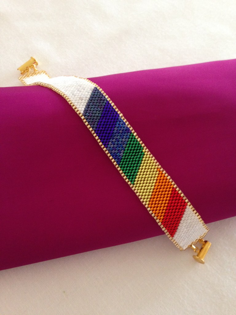Another rainbow bracelet in a different pattern. Bright and pretty on the wrist. A magnetic slider fastening.