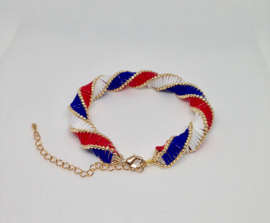 In celebration of the Jubilee here is a bracelet of red, white and blue with gold bead trim. It measures 7.5″ with a lobster clasp and an extension chain.