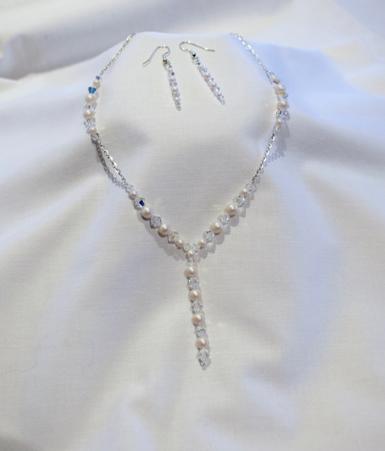 Swarovsky pearls and crystals make this little necklace into something very special with matching ear rings. Length 16″